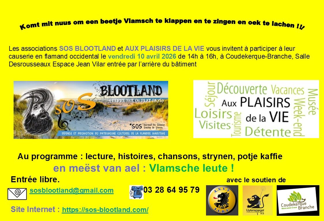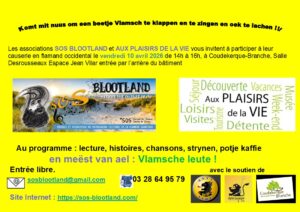 Mais la liste n’est pas exhaustive, vous pouvez aussi aller ‘klapper’ à Rexpoëde, Wormhout, Rubrouck, Berthen, etc… N’oubliez pas non plus notre émission dimanche 5 avril à 19h sur le 91.8 ou via notre site https://sos-blootland.com en cliquant sur le lion en bas à droite de la page d’accueil Ainsi que notre spectacle Femmes de marins, femmes de chagrin à Wormhout le dimanche 12 avril à 16h à la salle l’universelle. En espérant vous croiser ici ou là ou ailleurs /’T gaet hier of daer of gunter zyn Joël, Styntje, Colette, Claudine,Dominique, Jean-Claude et toute la troupe de joyeux bénévoles
